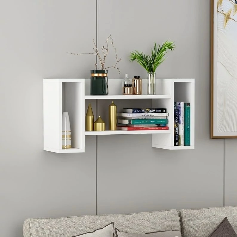 خرید کتابخانه دیواری مدرن | شلف دیواری طرح دار رنگ سفید مدل دیواری با طبقه در اندازه 80×40×20